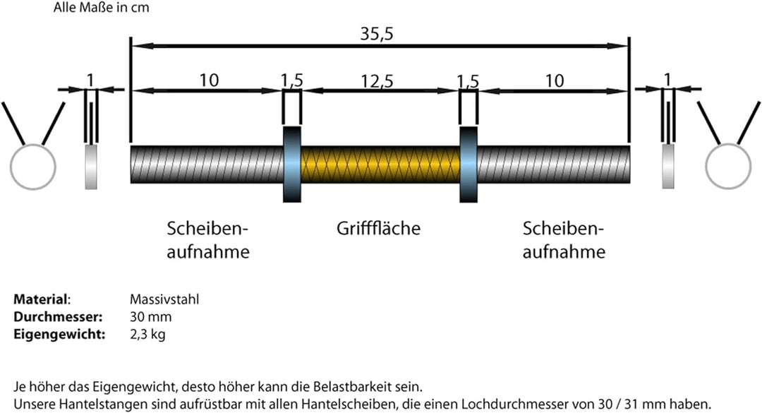 Bara robusta pentru gantere: greutate: 2,5 kg, lungime: 35 cm, material: solid, otel cromat, diametru: 30 mm, sarcina maxima: aprox. 50 kg