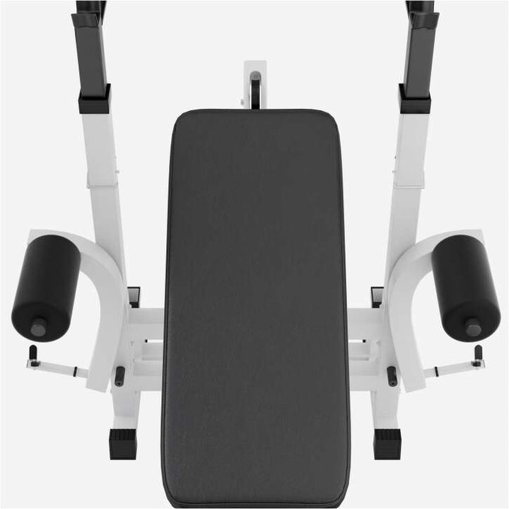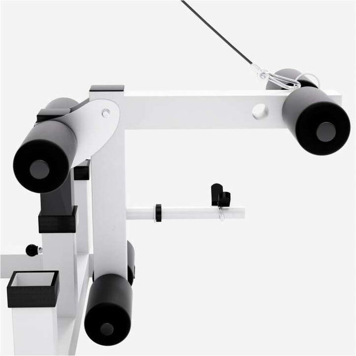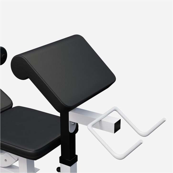 • O banca de greutati alb-negru cu suport de curl reglabil in trei directii si presa pentru picioare, suport pentru gantere reglabil in cinci directii cu bara de siguranta si suport pentru spate reglabil in sase directii