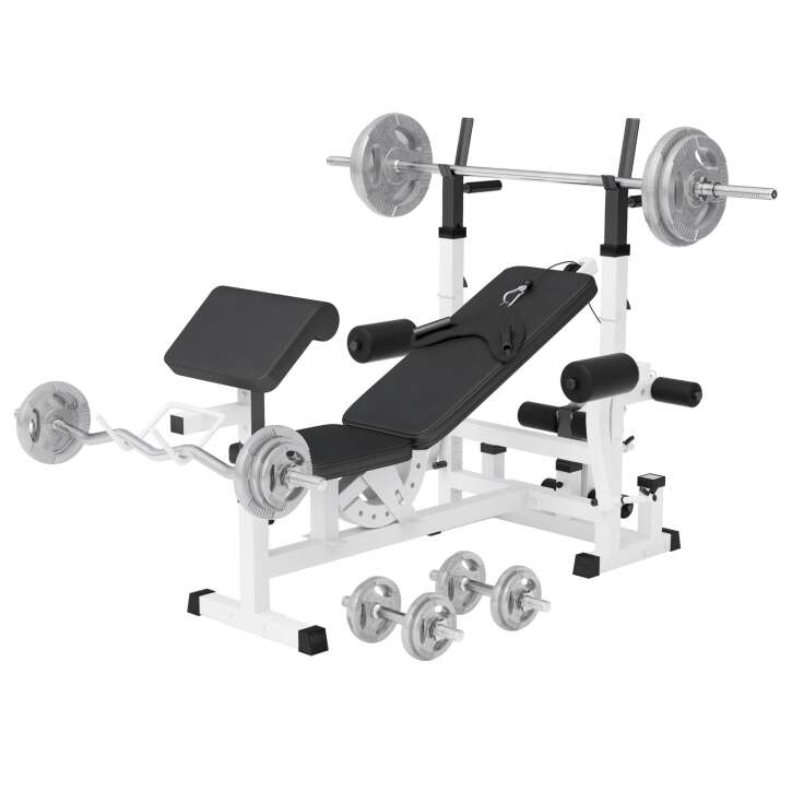 Banca multifunctionala iti ofera echipamentul perfect pentru antrenamentul intregului tau corp ca set complet format dintr-o banca de greutati si un set complet de greutati cu prindere de 108 kg. Banca de greutati alb-negru are 210 cm lungime, 70 cm latime si 122,5 cm inaltime si poate sustine pana la 280 kg. Capacitatea de incarcare este impartita in 180 kg pentru suporturile pentru gantere, 60 kg pentru picioare si 40 kg fiecare pentru brate.