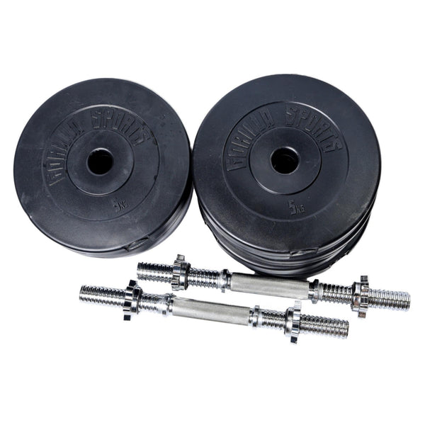 Set de 15kg : 2 gantere de 35 cm cu piulite 30/31mm Crom + Set 8 discuri din plastic umplute cu ciment 1.25 kg 30/31 mm