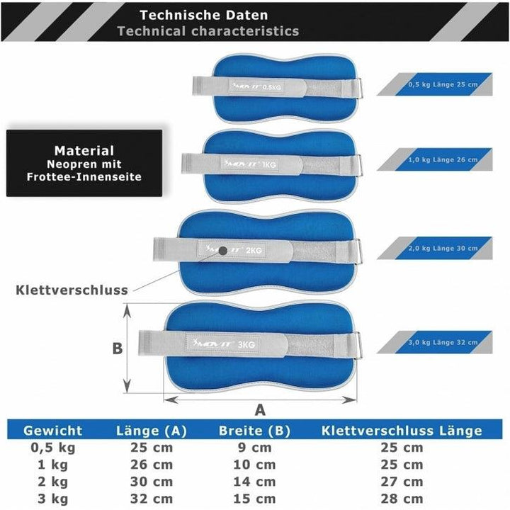 Greutăți din neopren pentru încheieturi mâini/glezne de cea mai bună calitate MOVIT, ideale pentru drumeții, jogging, gimnastică, reabilitare etc. pentru bărbați și femei. Camerele din neopren rezistente la rupere, prietenoase cu pielea și confortabile de purtat (testate pentru substanțe nocive), cusăturile întărite asigură o durată lungă de viață.