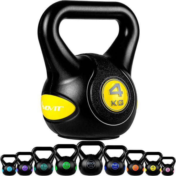 Kettlebell-ul MOVIT® de 2kg, este prevazut cu un invelis din plastic prietenos cu podeaua si un design solid si profesional cu umplutura compactata.