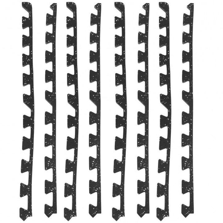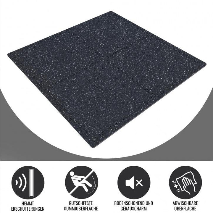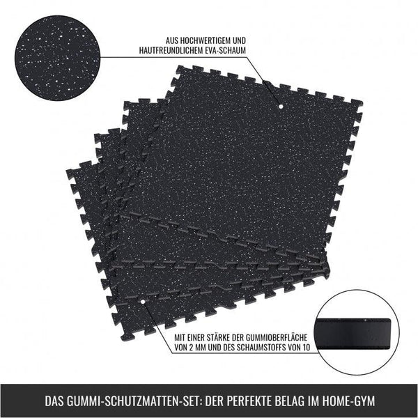 Setul de covorașe din cauciuc Gorilla Sports este format din patru covorașe și opt piese de capăt. Covorașele pătrate pot fi unite între ele după cum doriți, în timp ce piesele de capăt rotunjesc imaginea de ansamblu. Suprafețele prietenoase cu pielea ale covorașelor sunt ușor de curățat. Acestea protejează podeaua de zgârieturi și lovituri de la echipamente și gantere și atenuează zgomotul antrenamentului.