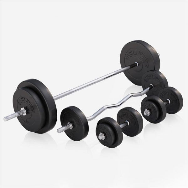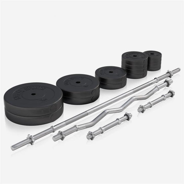Pachetul de greutăți include tot ce aveți nevoie, cu o bară dreaptă pentru piept, o bară Z și două bare cu gantere, plus o gamă variată de discuri din plastic care totalizează 100 kg. Finisajul din plastic pe greutăți ajută la prevenirea uzurii discului și zgârieturilor pe podea.