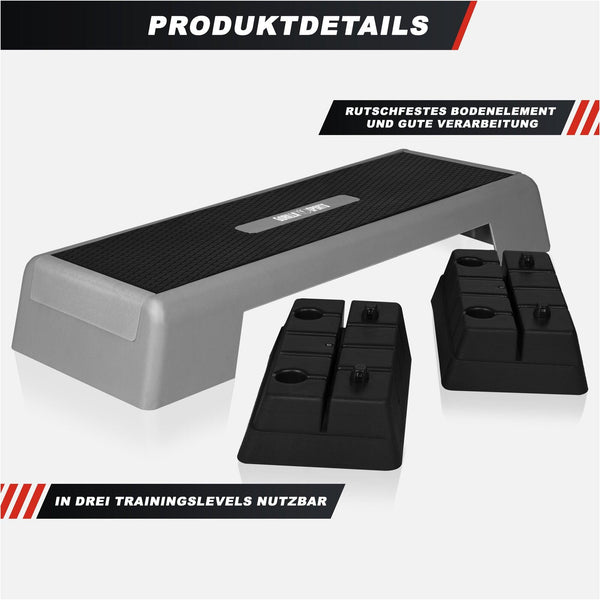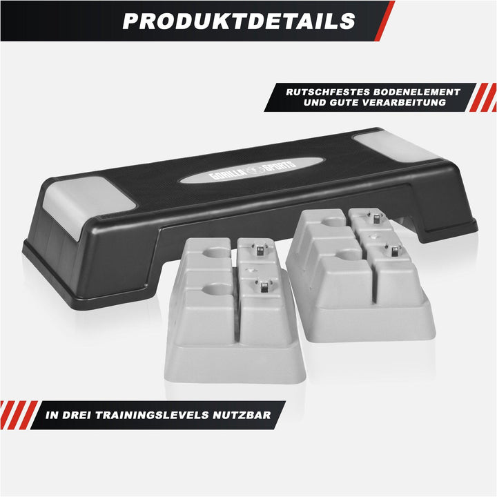 Pe Aerobic Stepper XS și XL, puteți efectua exerciții pentru a crește rezistența și a arde grăsimile. Exercițiile sunt potrivite pentru întărirea picioarelor, feselor și mușchilor spatelui. Atunci când este completat cu mișcări ale trunchiului și ale brațelor, întregul corp este antrenat. Aerobic Fitness Stepper XS și XL de la Gorilla Sports este un dispozitiv de antrenament optim pentru dezvoltarea și extinderea mușchilor picioarelor și feselor. Placa de step este un dispozitiv care economisește spațiu și oferă posibilitatea de a vă antrena corpul în mod optim cu diferite exerciții.