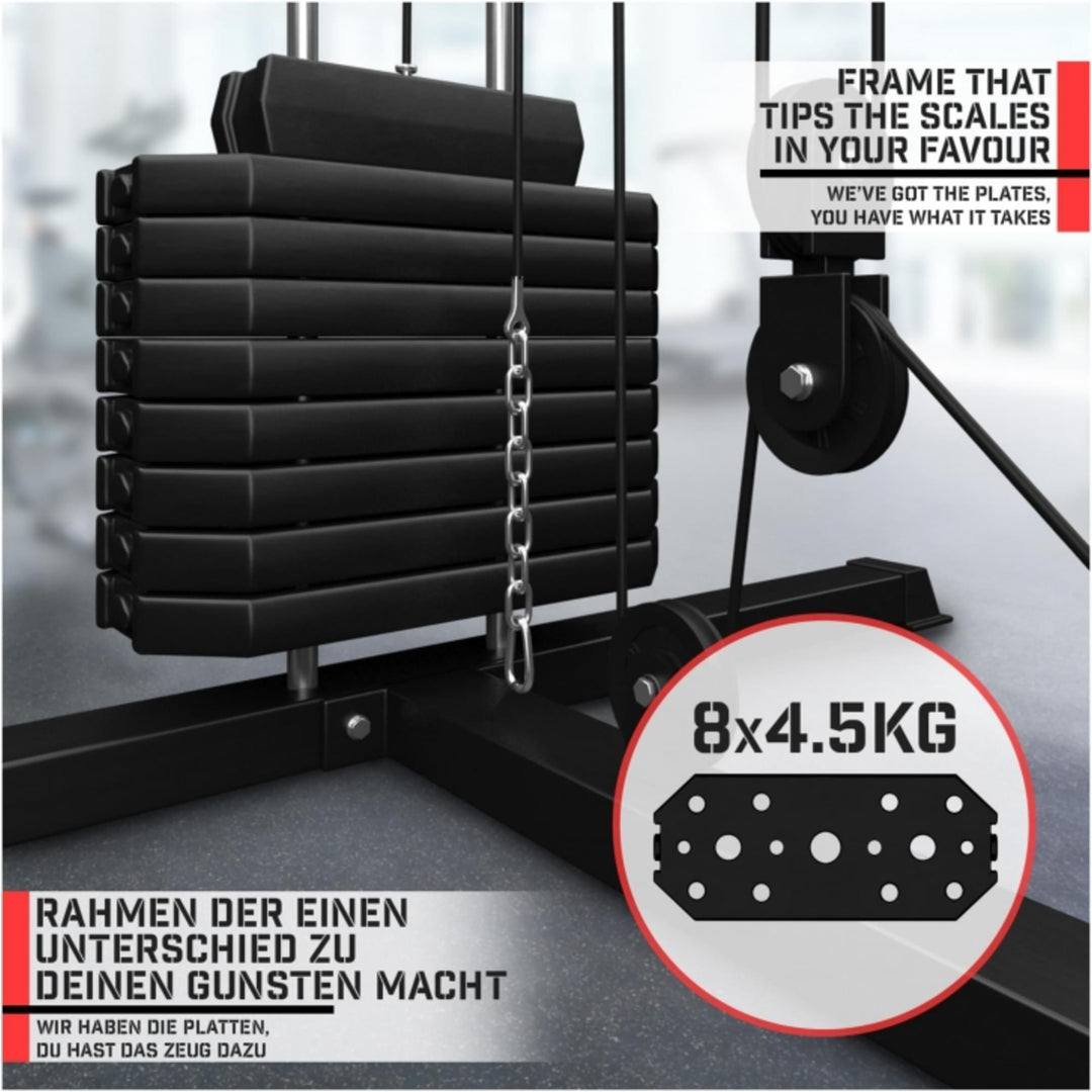 Acest aparat este o adevărată statie de exerciții universală care vă permite să efectuați mai mult de 30 de exerciții diferite. Scaunul captusit ofera confortul necesar. Datorită greutății totale de 40 kg a discurilor de greutăți, sarcina de antrenament poate fi personalizată prin adăugarea altor discuri de până la 120 kg (nu sunt incluse). Compact dar puternic - cu acest dispozitiv puteți realiza un antrenament complet într-un spațiu mic.