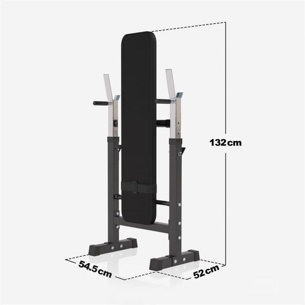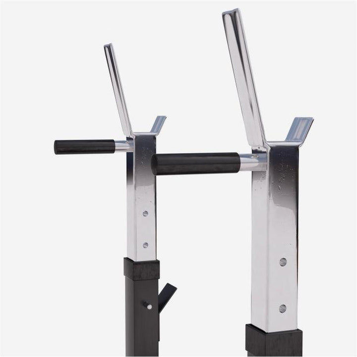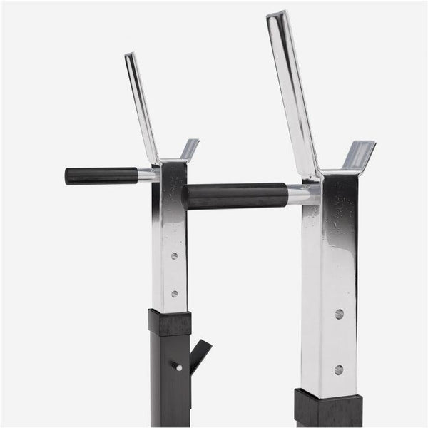 Are un suport de bara reglabil în cinci poziții, de la 92 la 112 cm, cu mânere integrate pentru greutate maxima de 200 kg