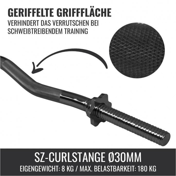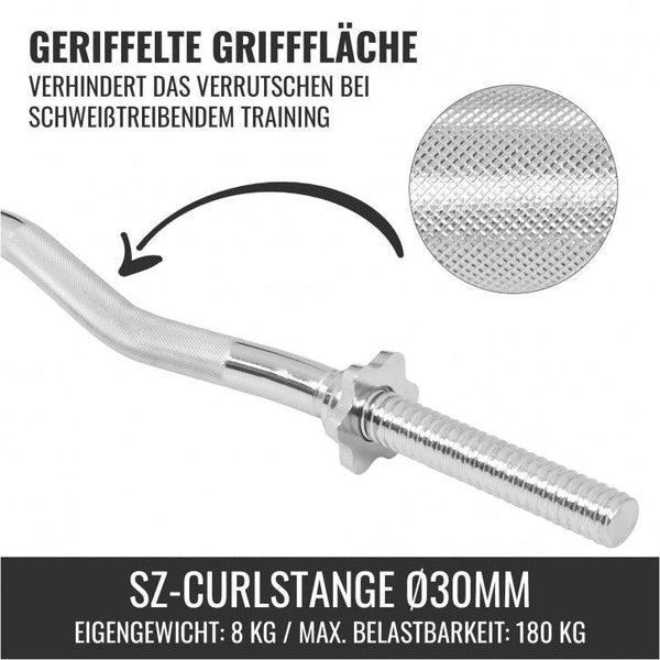 După cum spune vechea vorbă, bicepșii și tricepșii vor pune acum transpirația înaintea virtuții! Bara de curl SZ impresionează prin forma sa specială, curbată, care îți permite să antrenezi anumite grupe de mușchi într-o manieră țintită. Un alt avantaj al construcției este aderența excelentă pe care o ai în timpul antrenamentului și care minimizează căderea barei chiar și cu degetele transpirate.