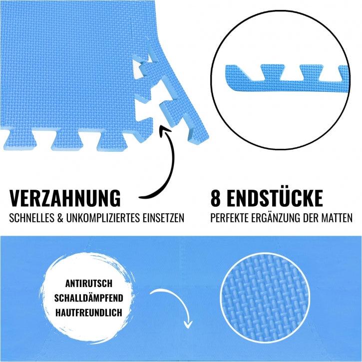 La Gorilla Sports veți găsi acum setul potrivit pentru a vă echipa covorașul de protecție cu piesa finală. La fel ca și covorașul de protecție, setul de piese finale conține opt părți. Acestea sunt interblocate pe o parte și se potrivesc perfect în interblocarea covorașelor. Capetele covorașului de protecție au 58,5 cm lungime și 1,2 cm înălțime fără dinți. Le puteți obține de la Gorilla Sports în culorile negru, albastru, gri și aspect de lemn.