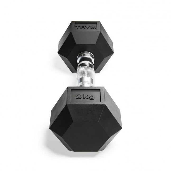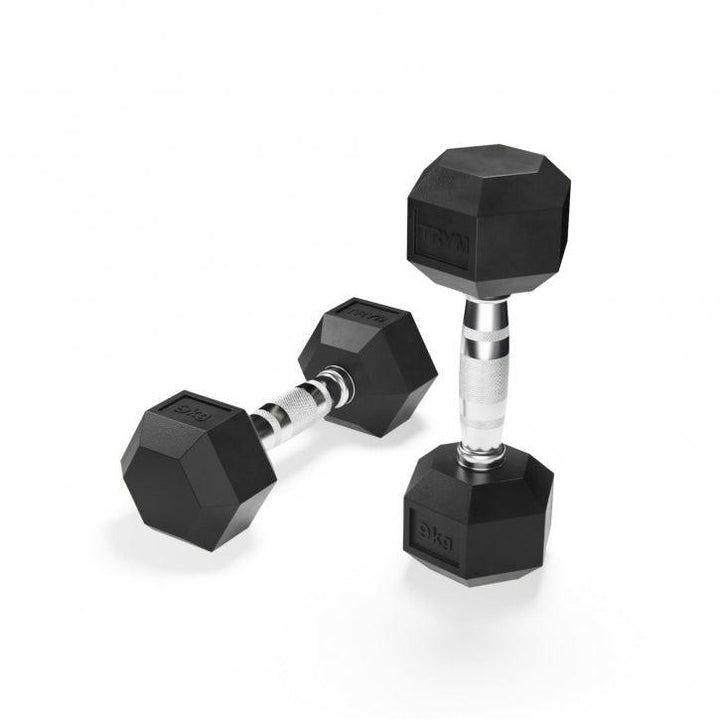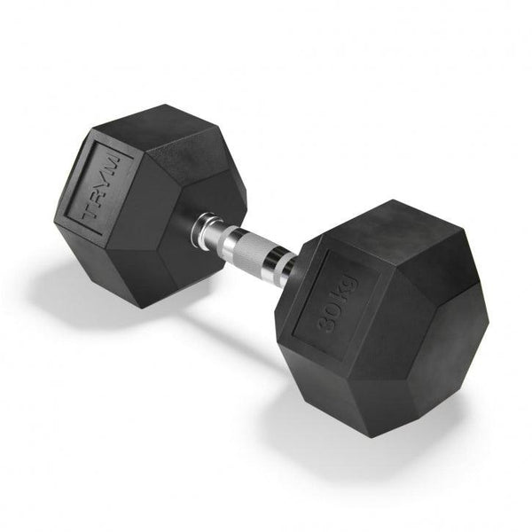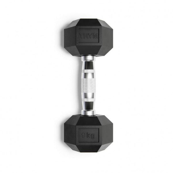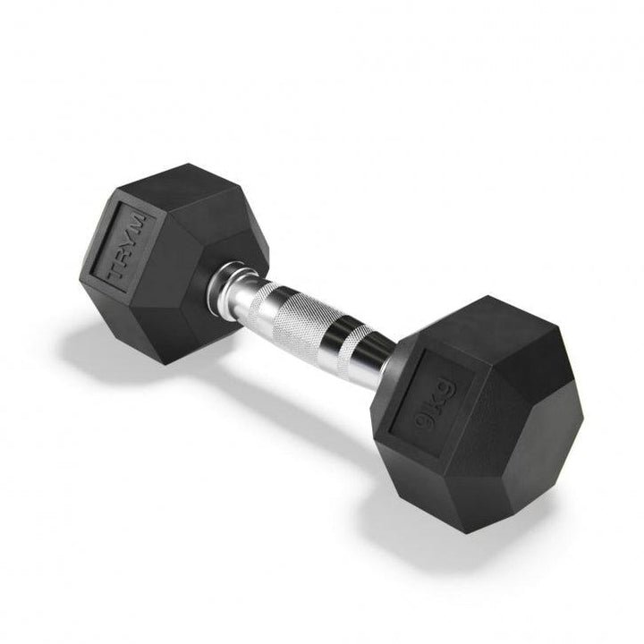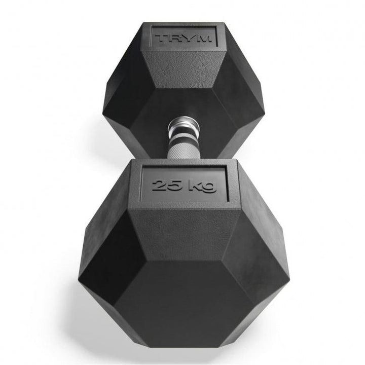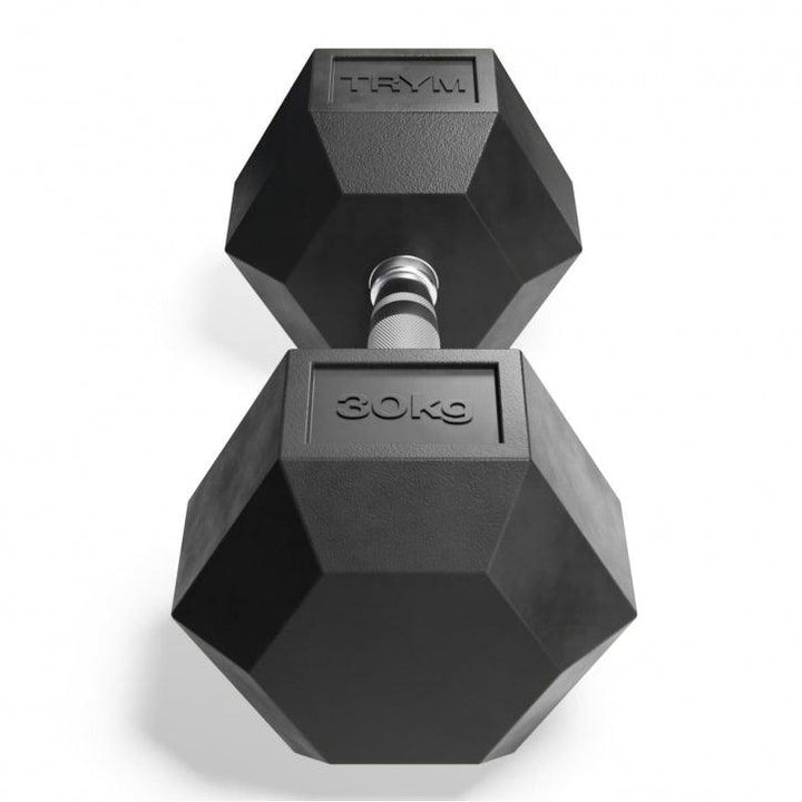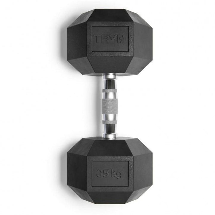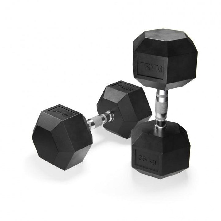 Halterele Trym Hex din cauciuc sunt clasicele in sala de sport. Disponibile de la 1 kg - 10 kg in trepte de 1 kg si 10 kg - 35 kg in trepte de 2,5 kg, aceste haltere ofera o gama larga de optiuni de antrenament. Fie ca este vorba de antrenament clasic de forta sau de cross-training, puteti efectua o varietate de exercitii cu halterele Hex. Datorita gamei largi de greutati, fiecare sportiv poate gasi greutatea de antrenament potrivita pentru antrenamente dificile. Capetele de greutate ale halterelor constau dintr-un miez de otel care este ferm atasat la maner. Invelisul de cauciuc durabil are proprietati de absorbtie a socurilor si ofera o protectie excelenta impotriva uzurii. Datorita formei hexagonale, halterele nu se rostogolesc atunci cand le puneti jos. Manerul cu forma ergonomica si zimtata sta bine in mana, iar invelisul cromat protejeaza impotriva coroziunii. Diametrul manerului este de 28 mm pentru halterele de pana la 5 kg si de 34 mm pentru halterele de pana la 35 kg. Siglele Trym in relief si numerele de greutate de pe ambele parti completeaza aspectul clasic si faciliteaza selectia. Halterele Trym Hex din cauciuc sunt vandute la bucata.