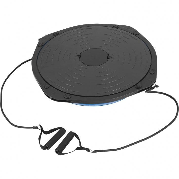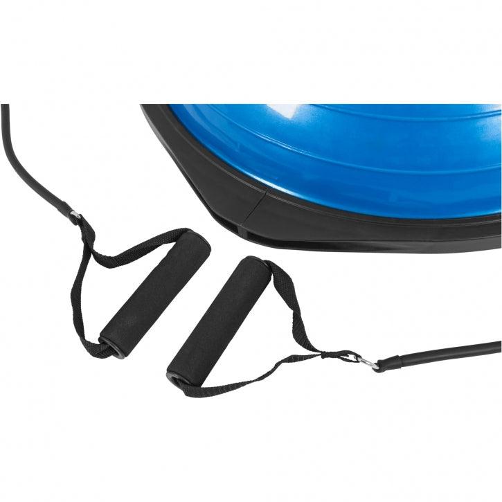 Îți întărește mijlocul corpului și articulațiile: mingea de echilibru, care poate fi folosită pe ambele părți, are o latură canelată, albastră, pe care o poți umfla cu pompa de mână inclusă. Spatele său negru, antiderapant, este plat și are frânghii cu mânere din spumă pe laterale.