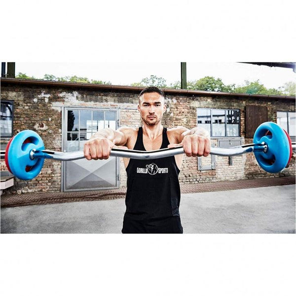 Pentru un antrenament eficient al forței: set cu bara piept, bară de Z și gantere de la Gorilla Sports.