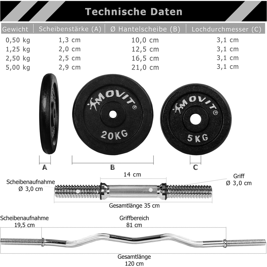 Setul de gantere, MOVIT bara SZ, 30 kg, este format din: 8 discuri de greutati (2x 5,0 kg, 2x 2,5 kg, 2x 1,25 kg, 2x 0,5 kg), 1x bara de gantere SZ de 120 cm, 2x bara de gantere de 35 cm, 6x bara de gantere 35 cm