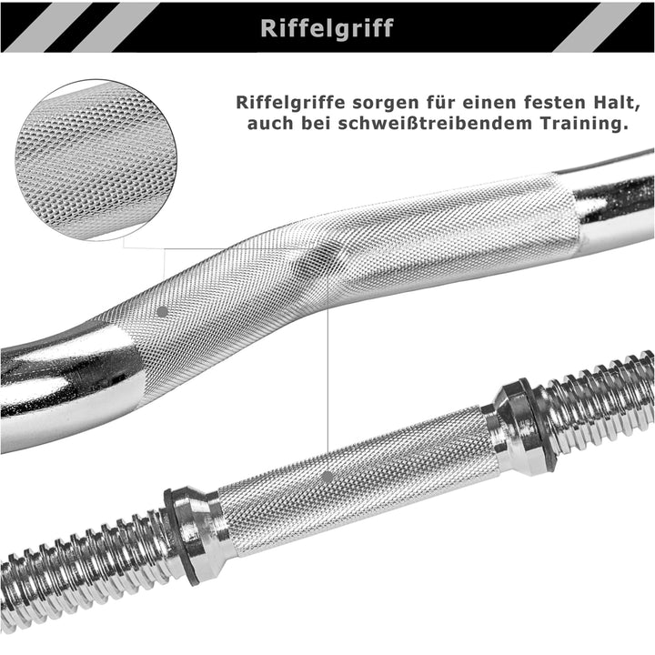 BARA SZ: Forma ergonomica pentru antrenament, care este blanda pentru coate si incheieturi, manerele anti-alunecare asigura o prinderea chiar si atunci cand transpirati, piulite in stea si bara din otel cromat, suport disc 30 mm (standard) , capacitate maxima de incarcare 120 kg