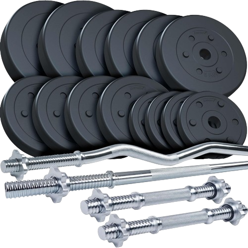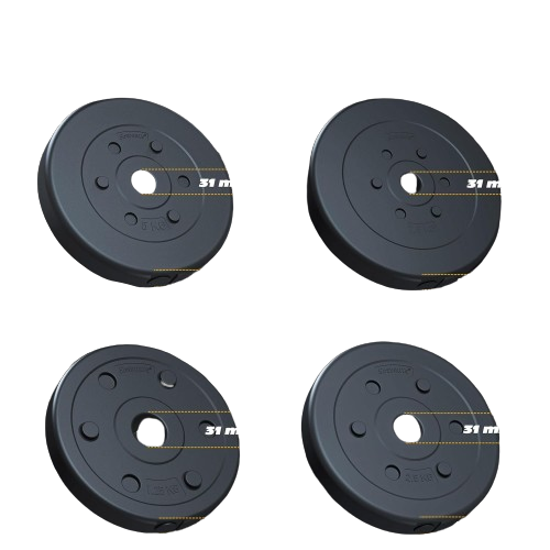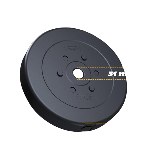 Durabil: discurile de greutăți ale setului de haltere constau in miezul unui amestec de ciment foarte bine comprimat și sunt echipate cu un strat de plastic și cu indicarea in relief a kilogramelor