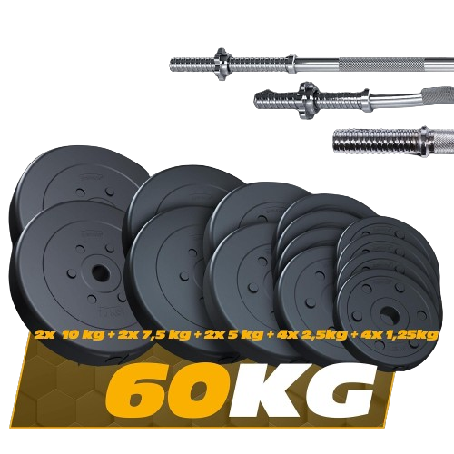 Nu mai puteți adăuga Set de haltere, bare si discuri, 60 kg, plastic, negru ScSports în coș.
