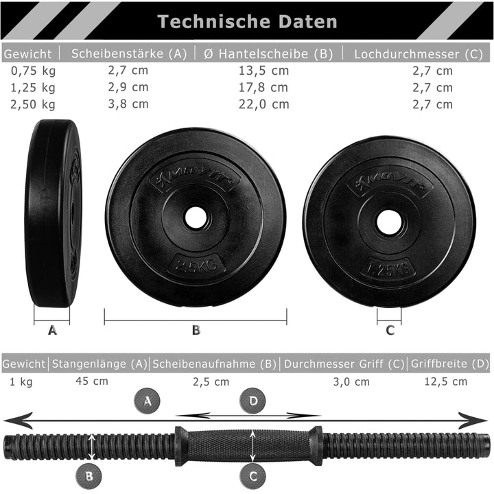 Cu setul de gantere MOVIT, nu numai ca iti modelezi silueta, dar iti intaresti si muschii si dezvolti forta. Cu acest set esti bine pregatit pentru multe exercitii de antrenament cu greutati. Piulitele stea asigura ca discurile stau intotdeauna ferm si sigur pe bare. De asemenea, preveniti zgomotul enervant al discurilor. Ganterele au fiecare doua fire trapezoidale indestructibile - cel mai sigur mod de a atasa discurile.