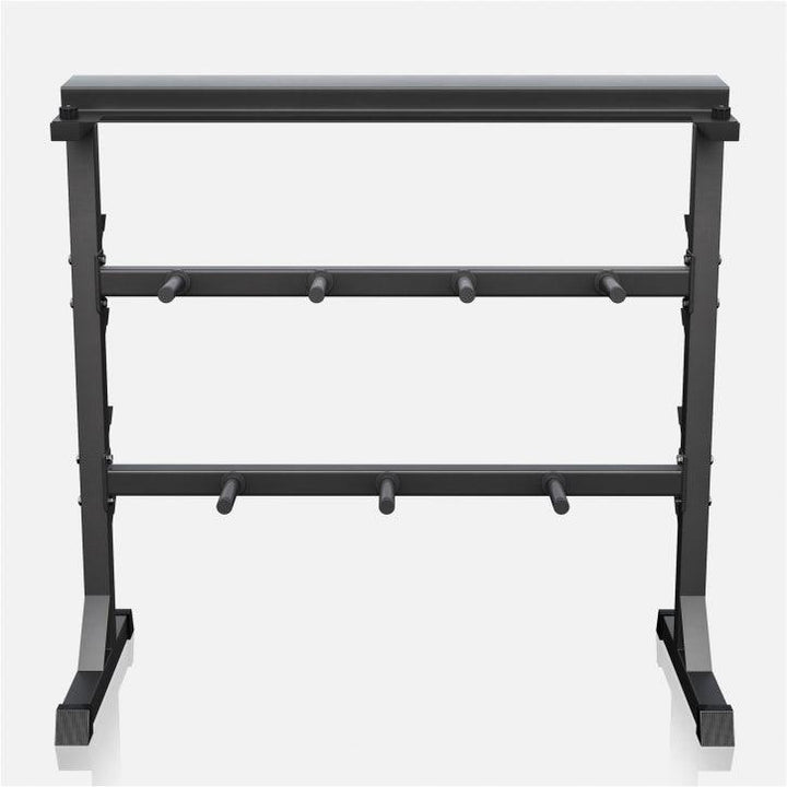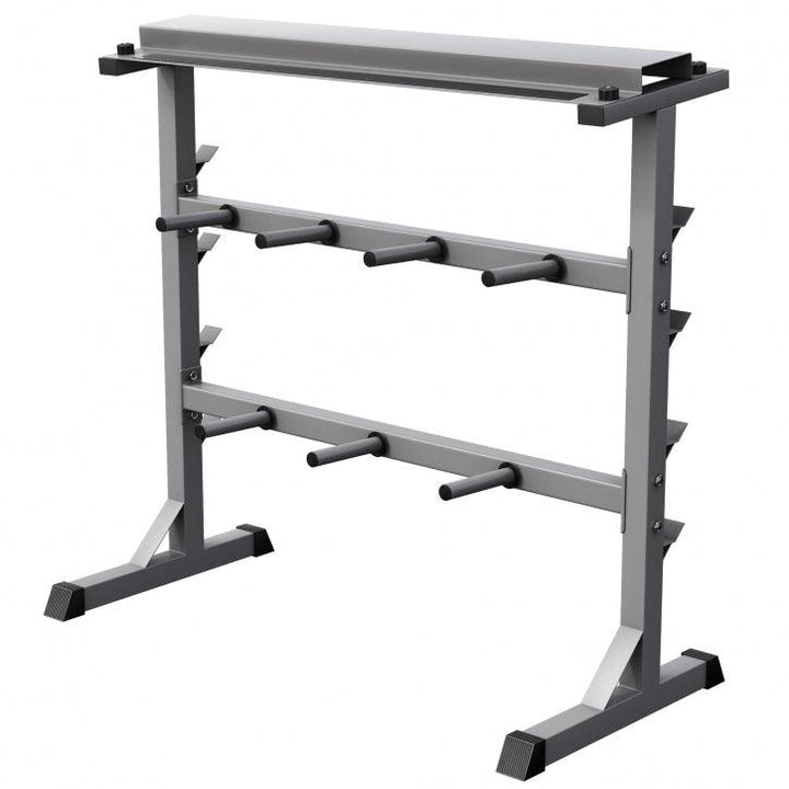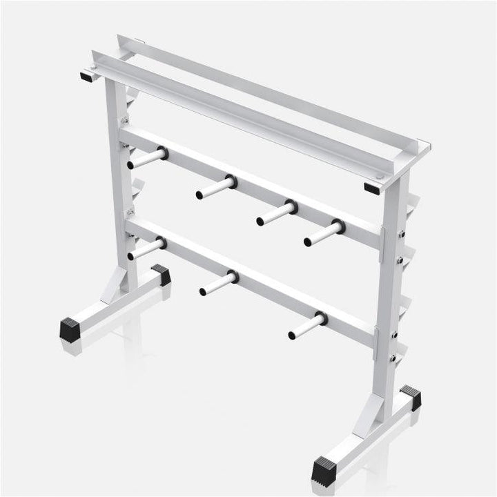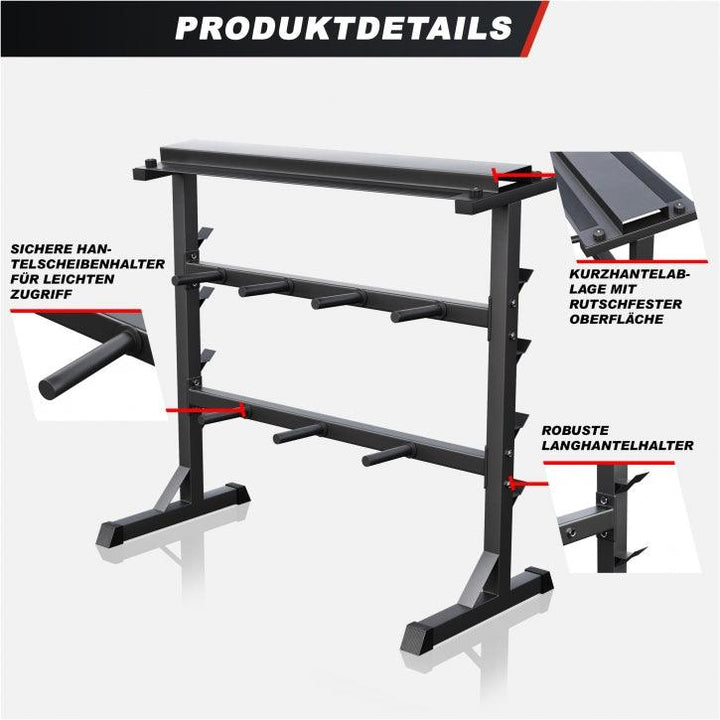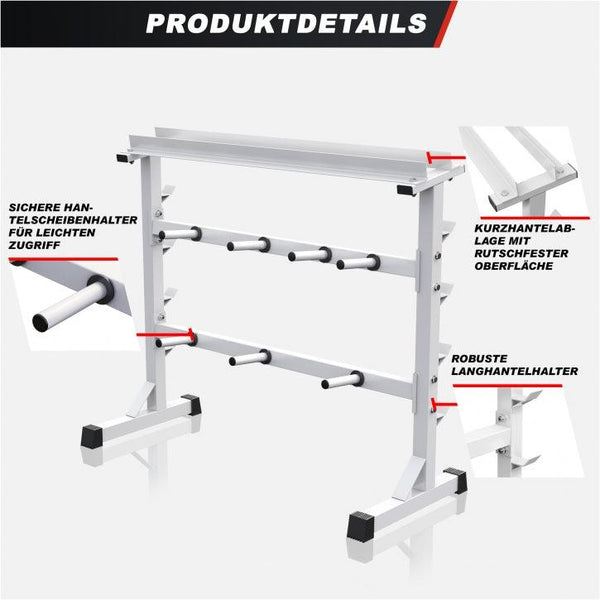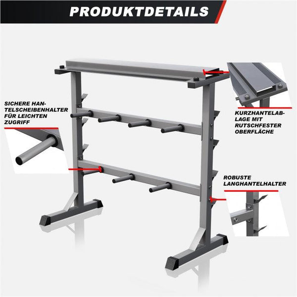 Suportul pentru discuri este fabricat din tuburi de oțel de înaltă calitate și este format din tuburi pătrate de oțel robuste. Suporturile pentru discuri sunt potrivite pentru discuri cu un diametru interior de 30/31 mm. O caracteristică suplimentară utilă a raftului este partea superioară, care susține un rând de gantere gata montate.